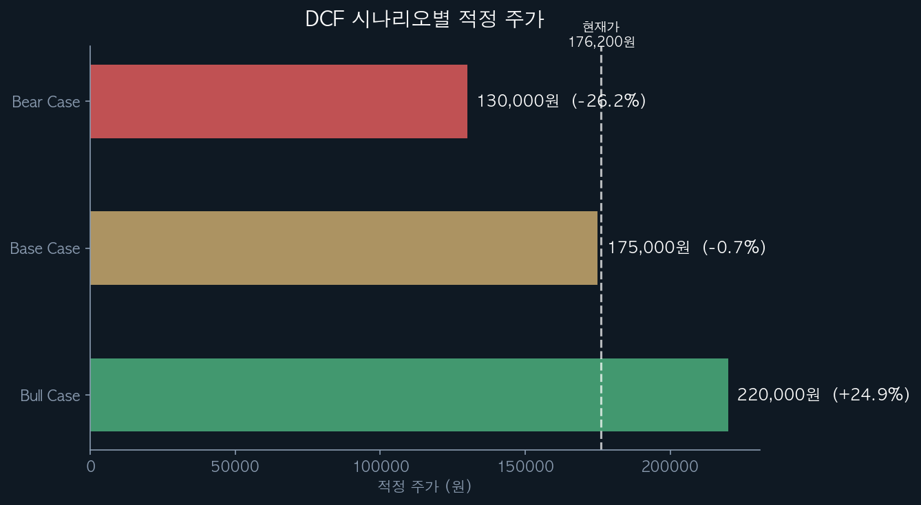 세 가지 시나리오를 종합하고 각 시나리오에 가능성 가중치를 부여한다. Bear 30%(규제 리스크는 실제로 진행 중이며 무시하기 어려움), Base 55%(회사 가이던스 달성이 가장 가능성 높은 경로), Bull 15%(해외·NGP·정관장 동시 호조는 낮은 확률)(가정). 가중평균 적정주가는 130,000×0.30 + 175,000×0.55 + 220,000×0.15 = 39,000 + 96,250 + 33,000 = 168,250원이 도출된다. 이는 현재 주가 176,200원과 거의 일치한다.