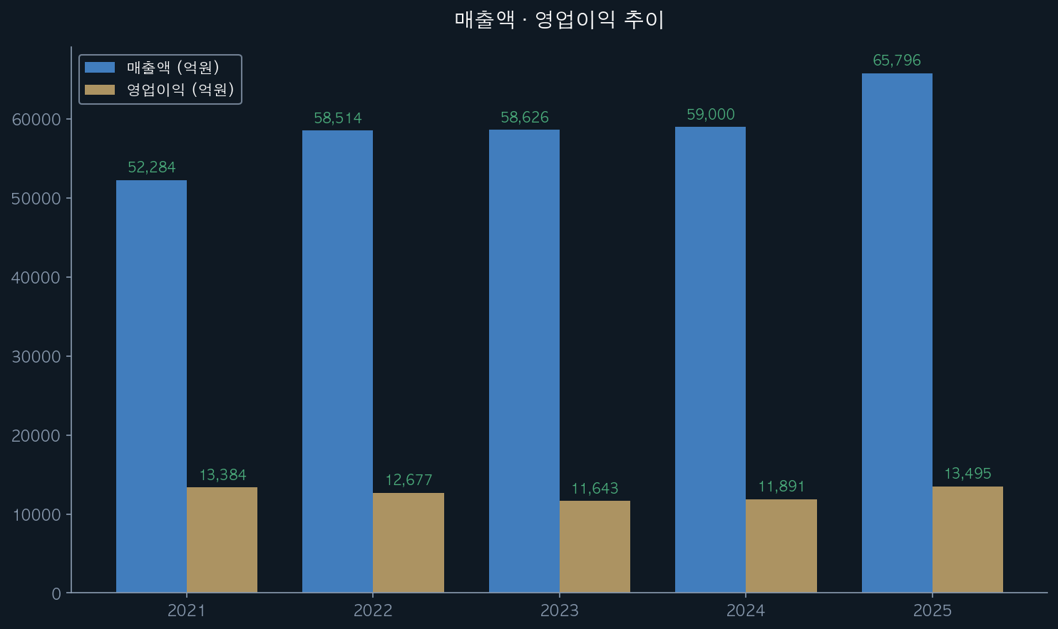 | 2025 | 65,796 | 13,495 | 20.5% | 약 10,000 | 약 12.3% | 약 52.0% |