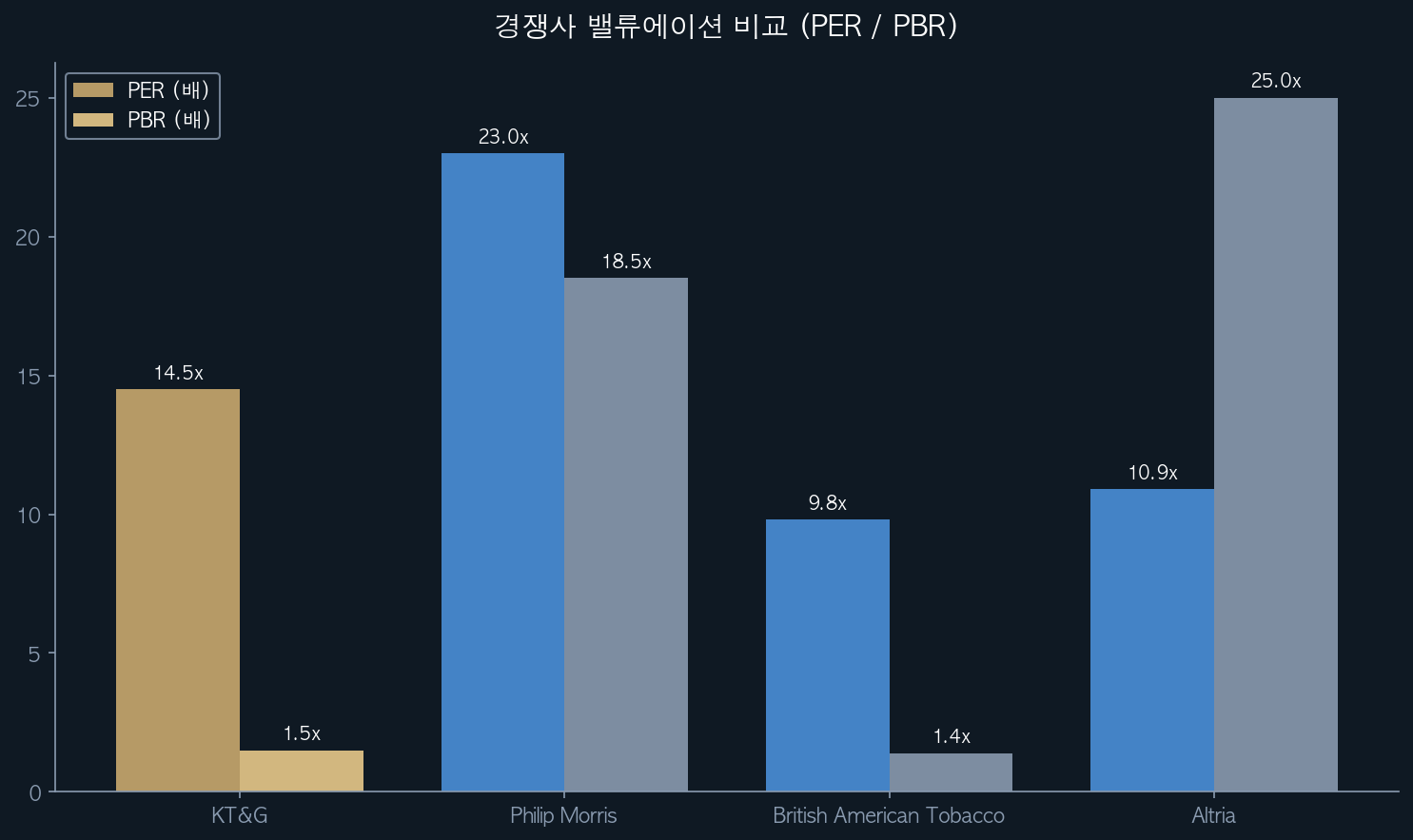이 표가 의미하는 바는 명확하다. KT&G는 영업이익률에서는 글로벌 빅4 대비 다소 낮지만, 재무 건전성(부채비율)에서는 압도적으로 우월하다. ROE는 BAT보다 높고 JT와 비슷한 수준이며, 배당수익률은 BAT보다 낮지만 PMI와 비슷하다. 즉 “글로벌 평균 수준의 수익성, 글로벌 최고 수준의 재무 안정성”을 갖춘 회사로 평가할 수 있다.